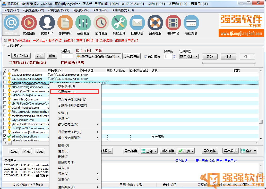 当有存量代理时,你也可以在“发信邮箱”界面右键菜单中选择“分配绑定IP” 进行自动分配