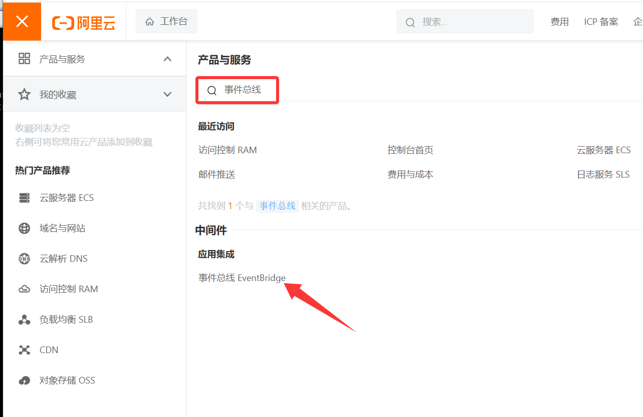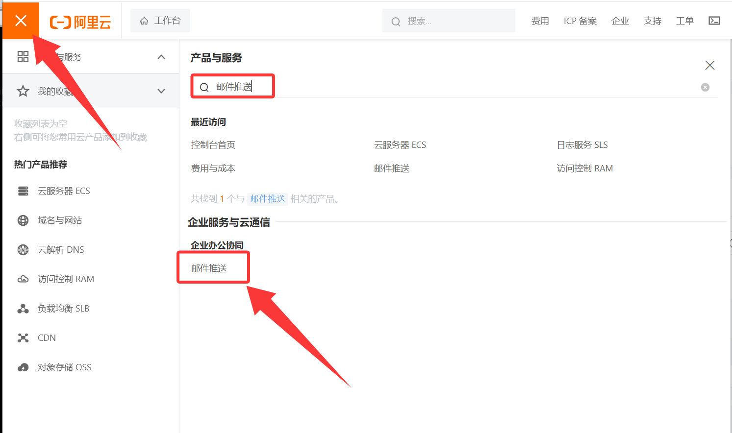 点击左上角图标展开“产品与服务”菜单,在搜索框中输入“邮件推送”,并点击进入