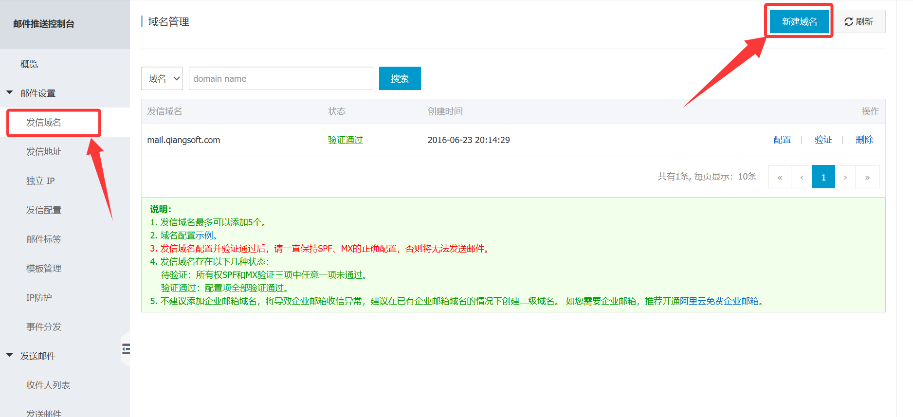 左侧导航栏选择“发信域名”,然后点击“新建域名”