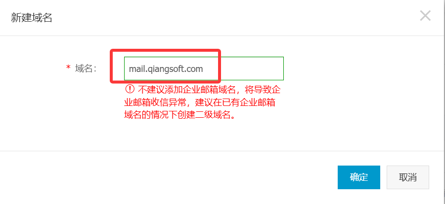 输入你的域名,这里按照红字提示,输入二级域名,不要输入你的顶级域名!例如: 你的主域名是 qiangsoft.com 就输入 xxx.qiangsoft.com 这样的二级域名,如图所示,我这里示例中输入的是 mail.qiangsoft.com