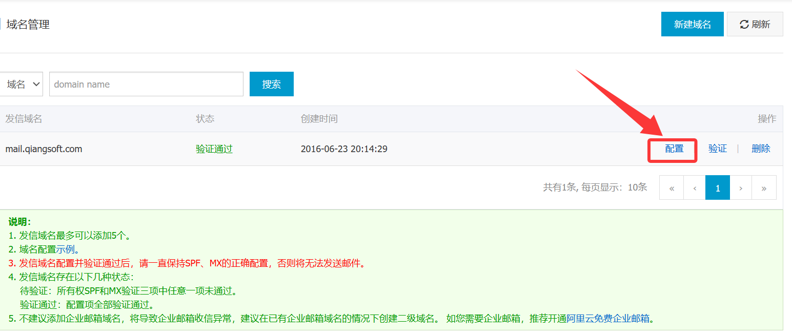 点击确定后会自动回到域名管理页面,此时点击“配置”,进行DNS记录配置