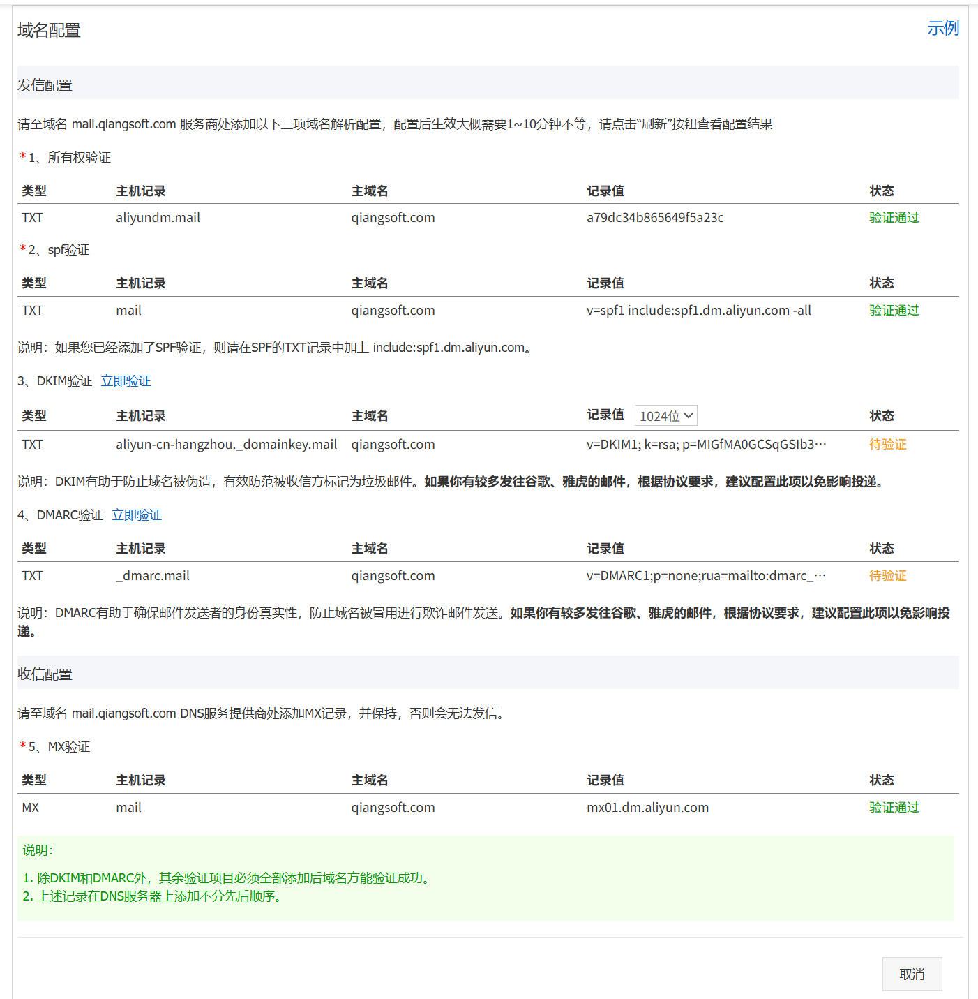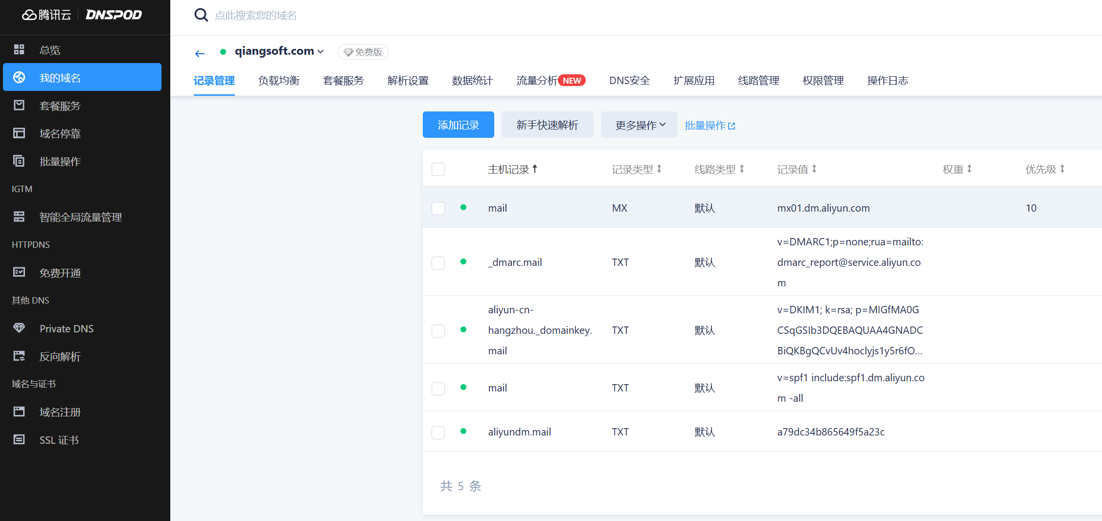 到你的域名控制面板上按要求配置好所有记录,这里以腾讯云旗下的dnspod为例,其他域名商的配置方法也是类似的, 注意MX记录优先级是必填值,填写10就行了。