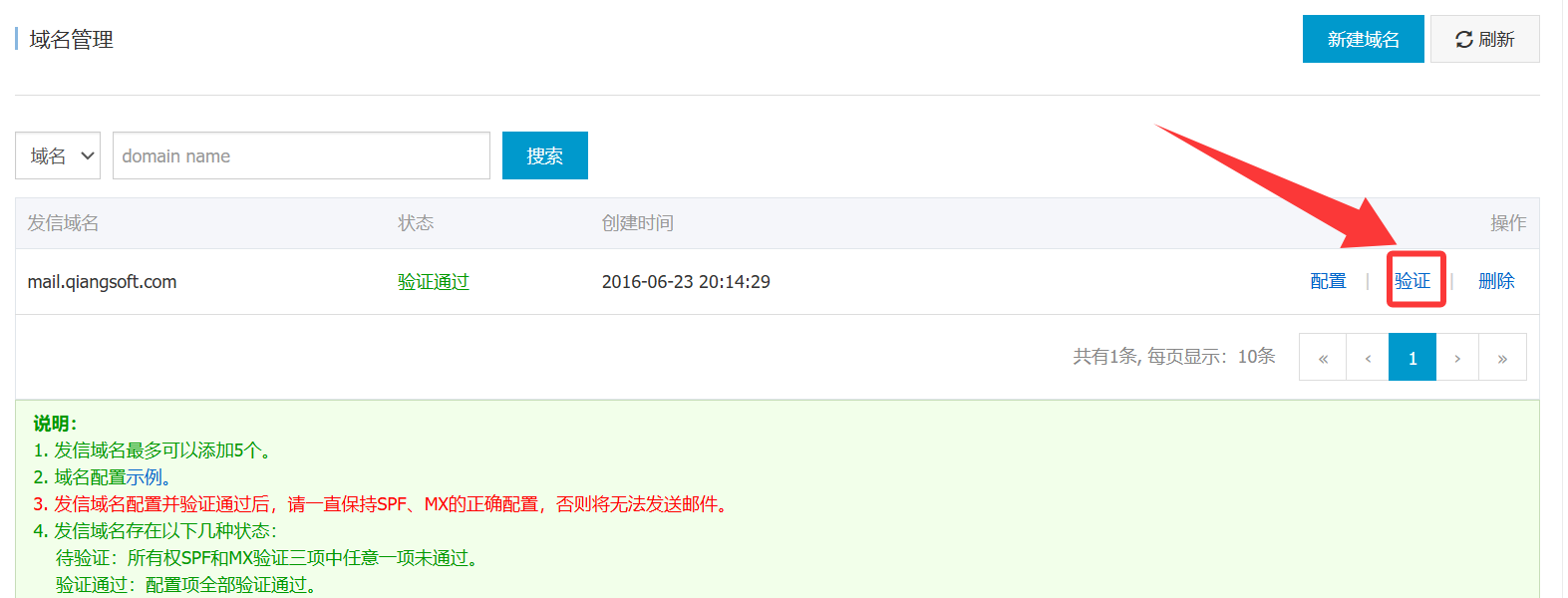 然后在域名管理界面中点击“验证”,如果一切无误,将会显示“验证通过”,注意不同域名商的DNS记录生效时间可能不同,有的需要几小时才能同步成功,如果确认DNS记录没有配置错误,而暂时无法通过验证,可以等待一段时间