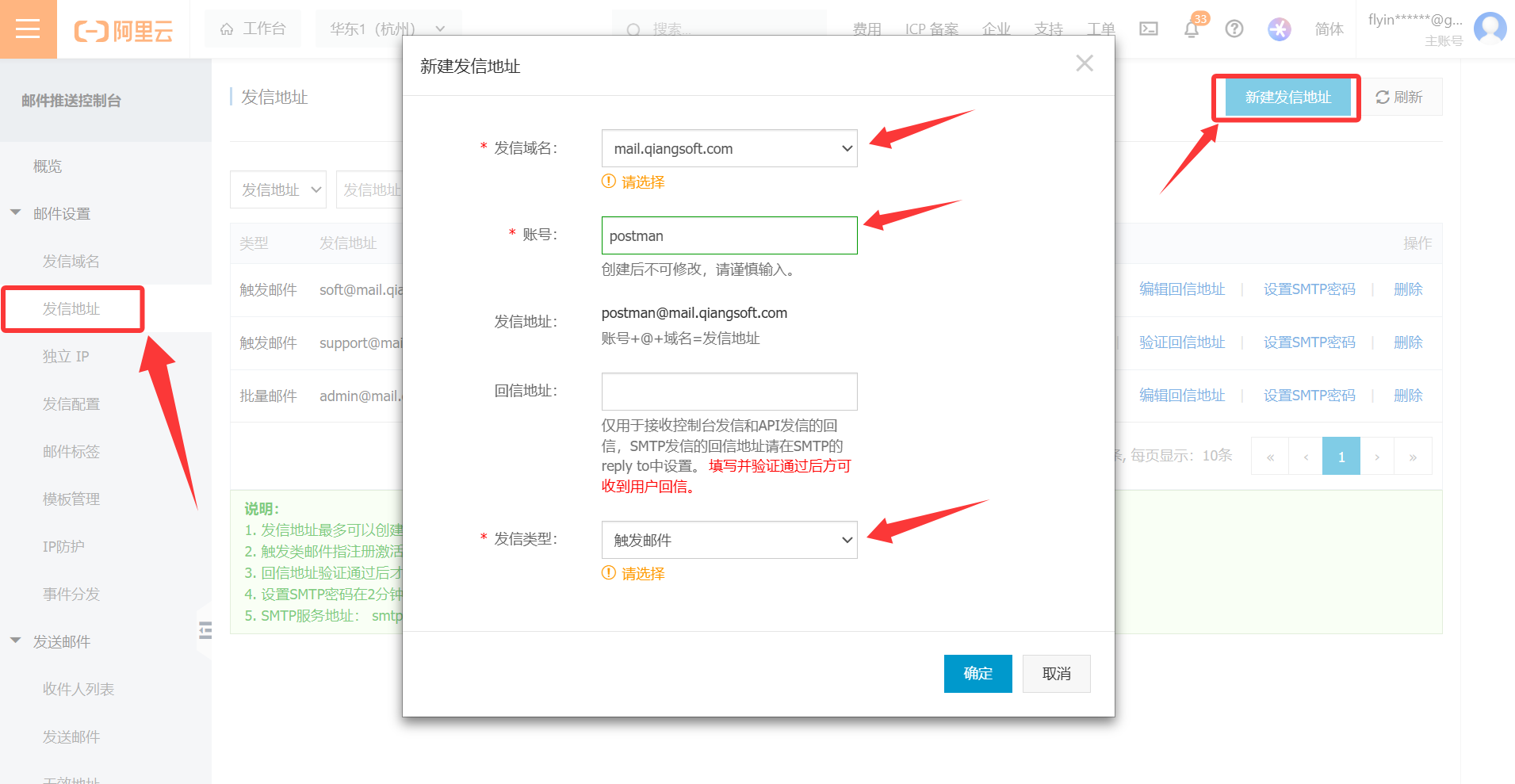 下面我们来配置发信地址,发信域名选择你刚才配置好的域名,账号随便起一个名字,发信类型选择“触发邮件” ,这里我们需要通过软件一封封的发送,所以选择“触发邮件”,如果还需要使用云端收件人列表来发送,则可以再增加一个类型为“批量邮件”的发信地址。