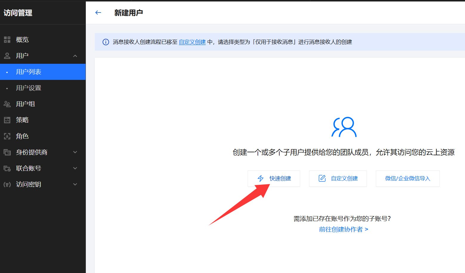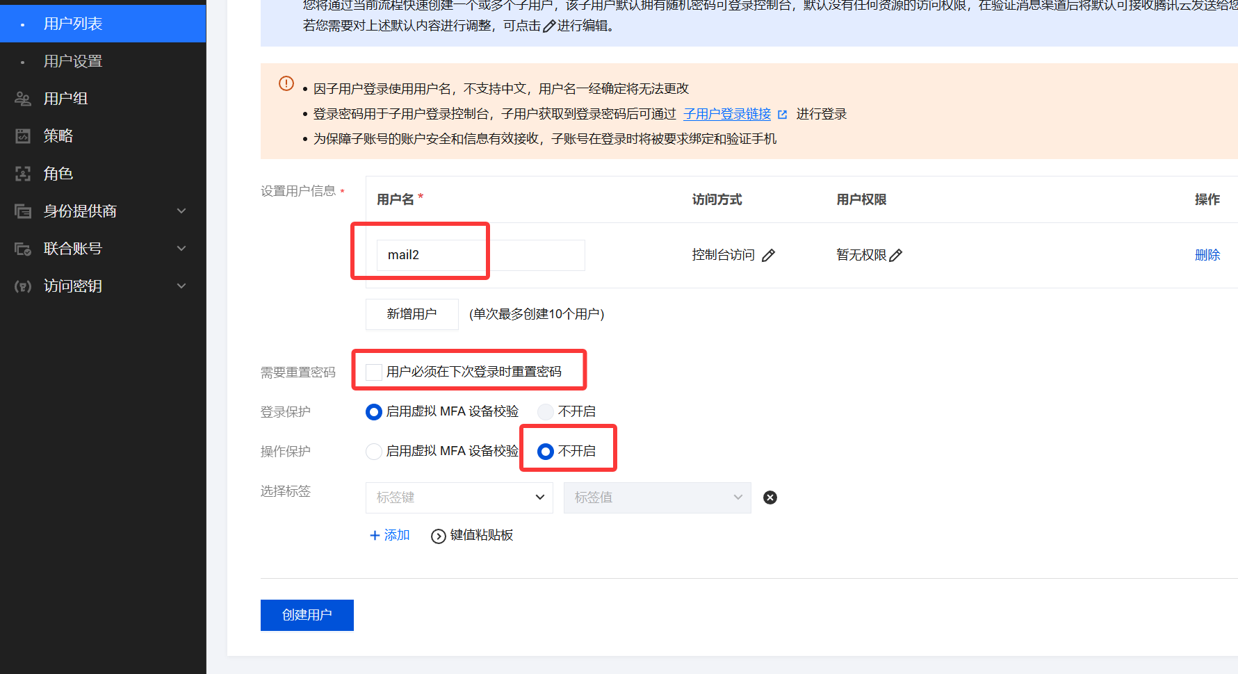 输入用户名,如图设置,点击“创建用户”,用户权限我们可以在用户创建完成后再添加,这里可以不设置