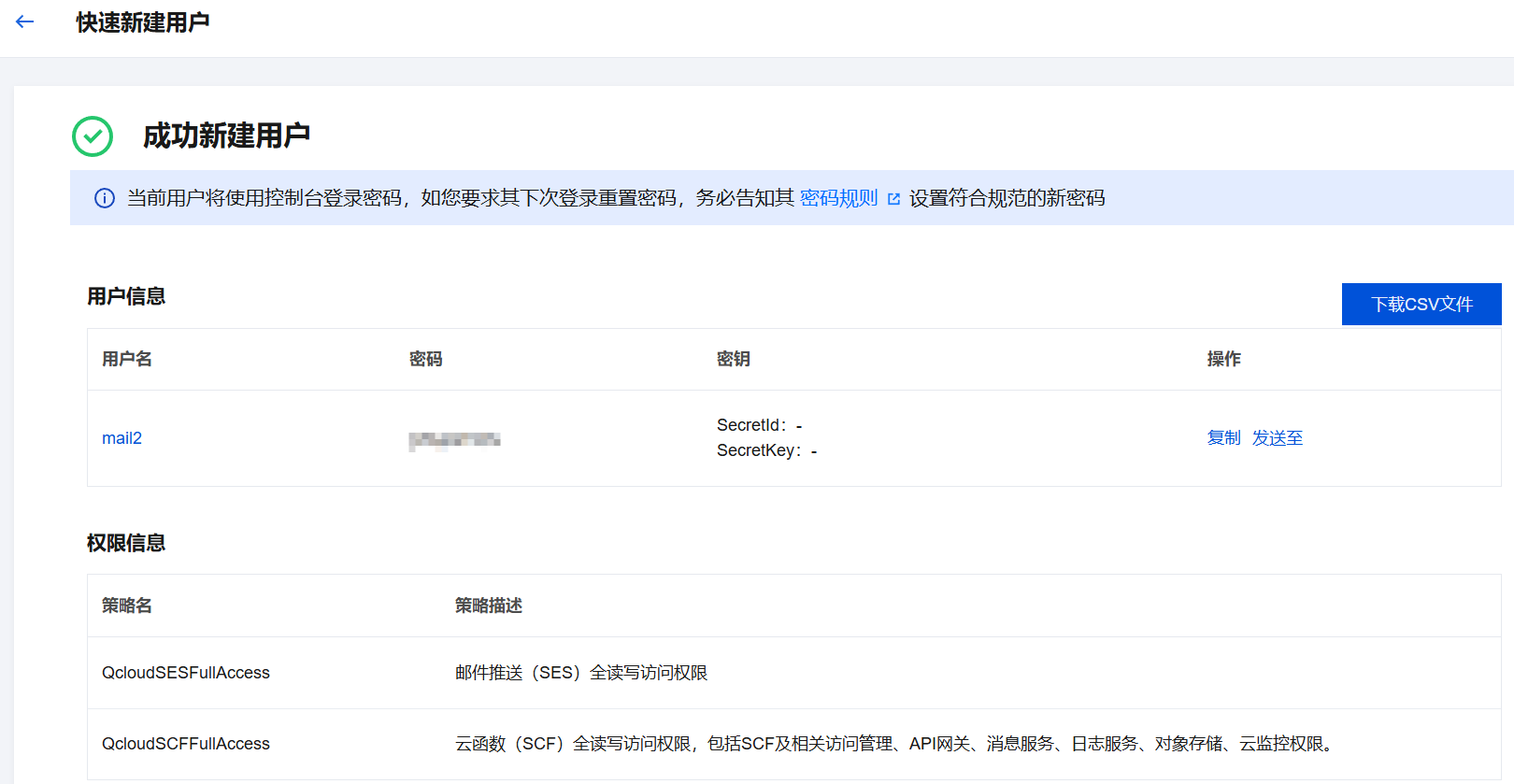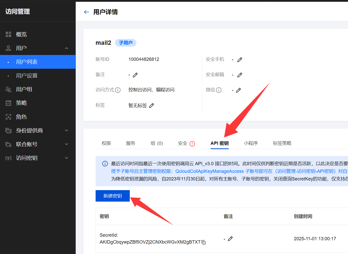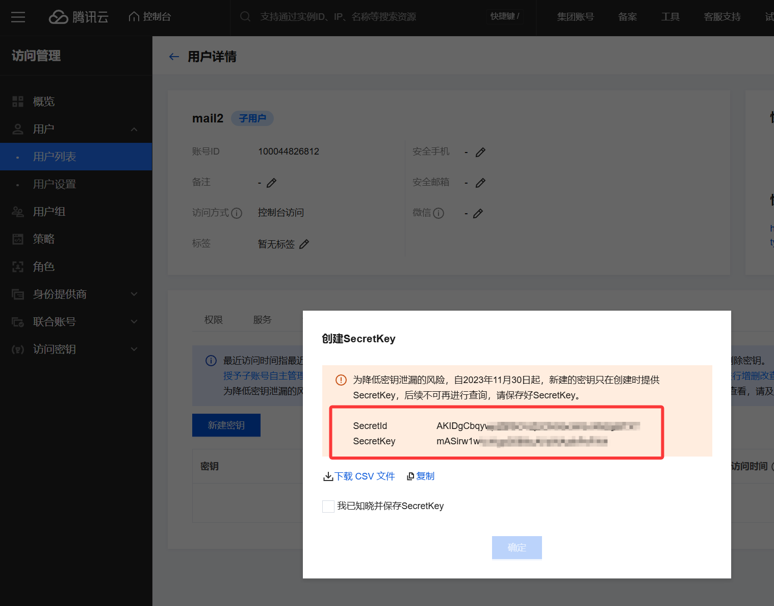 此时一定要及时复制 SecretId 和 SecretKey 两项,也就是密钥对,此页面关闭后将无法再次获取信息!