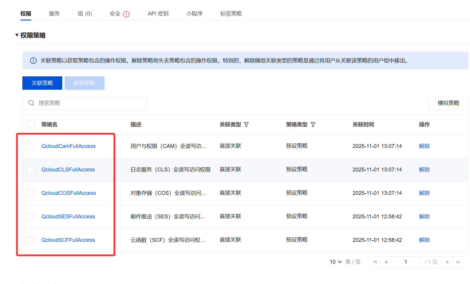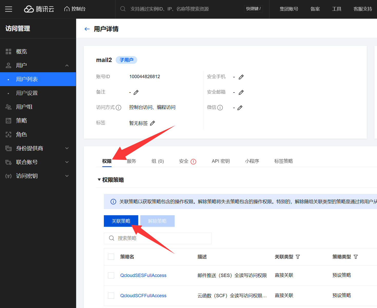 最后我们来配置下权限,且到“权限”页面,点击“关联策略”