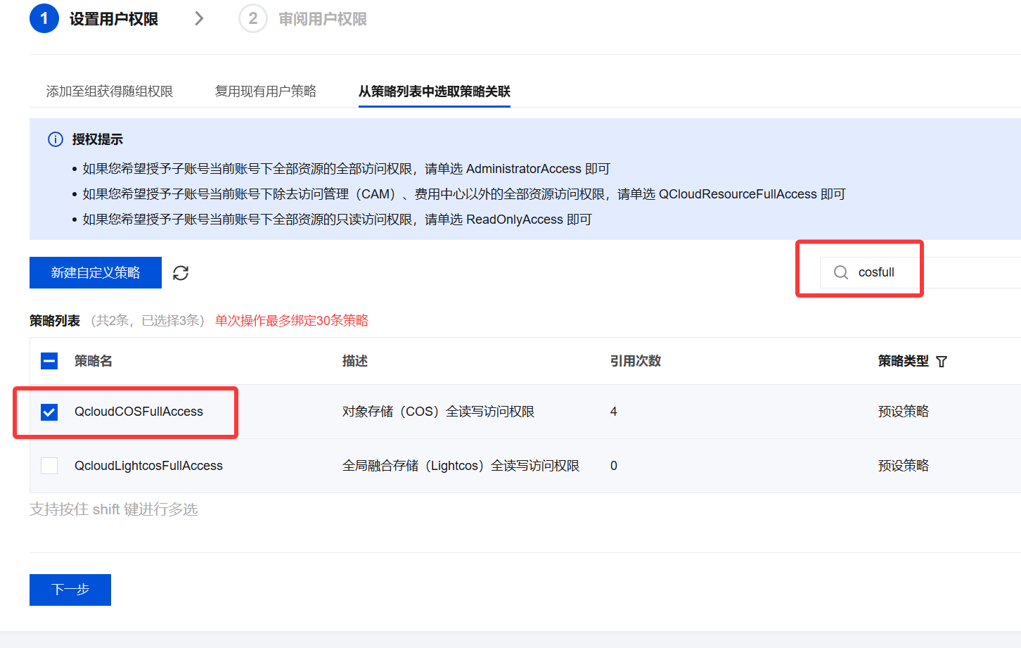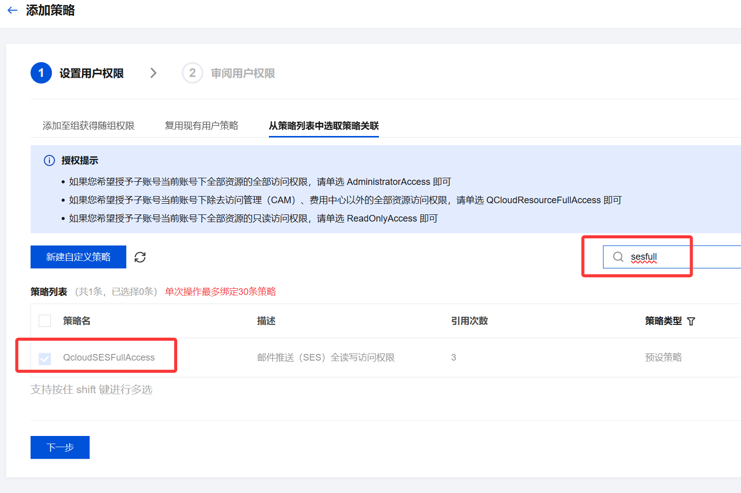 选择“从策略列表中选取策略关联”,然后在右上角搜索框中直接搜索系统内置策略名称,这里我们输入 sesfull 接着回车,就能在下面的列表中找到我们需要的策略名,勾选即可