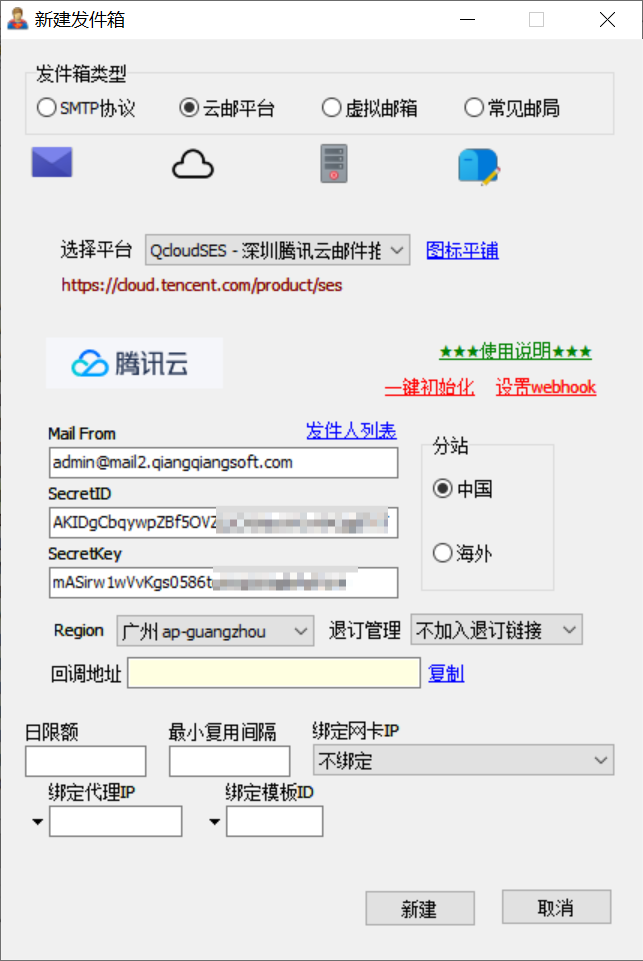 现在让我们在软件上试发一下邮件,打开软件,新建发件箱,选择云平台,选择腾讯云