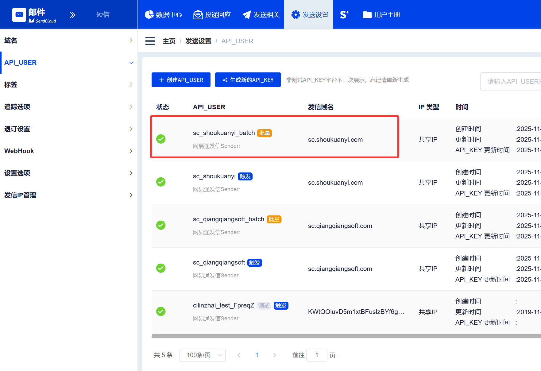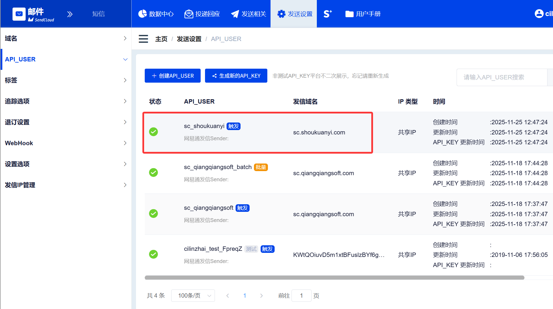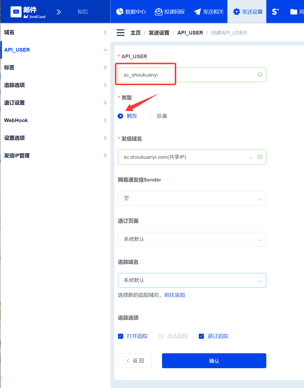 输入API_USER名称,这里建议参考自己的域名,例如我的域名是 sc.shoukuanyi.com 就用 sc_shoukuanyi, 以方便记忆,类型可以选择触发或者批量,建议分别创建一个,触发类型用于发送事务性通知类的邮件,批量类型用于群发营销性质的邮件,发信域名选择刚才验证通过的域名,其他默认