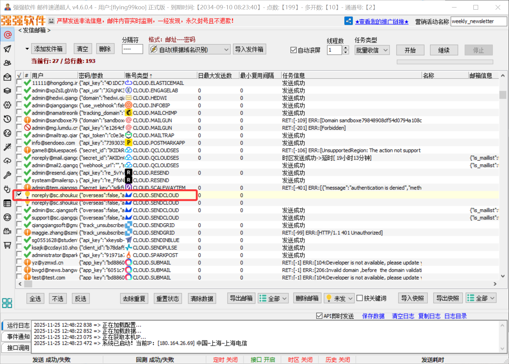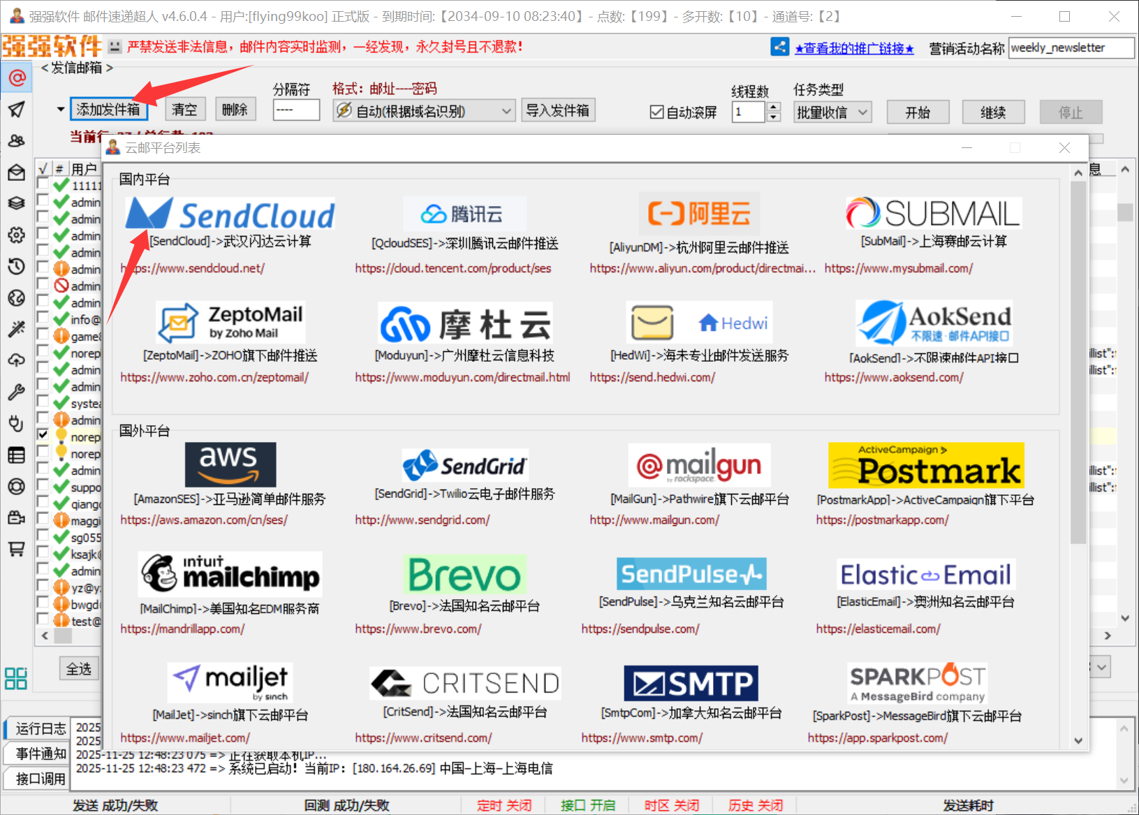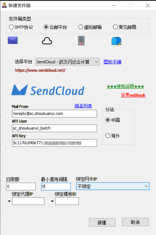 现在所有网站端的配置都已经完成,让我们回到软件中做后续配置,点击“添加发件箱”,选择云平台 sendcloud