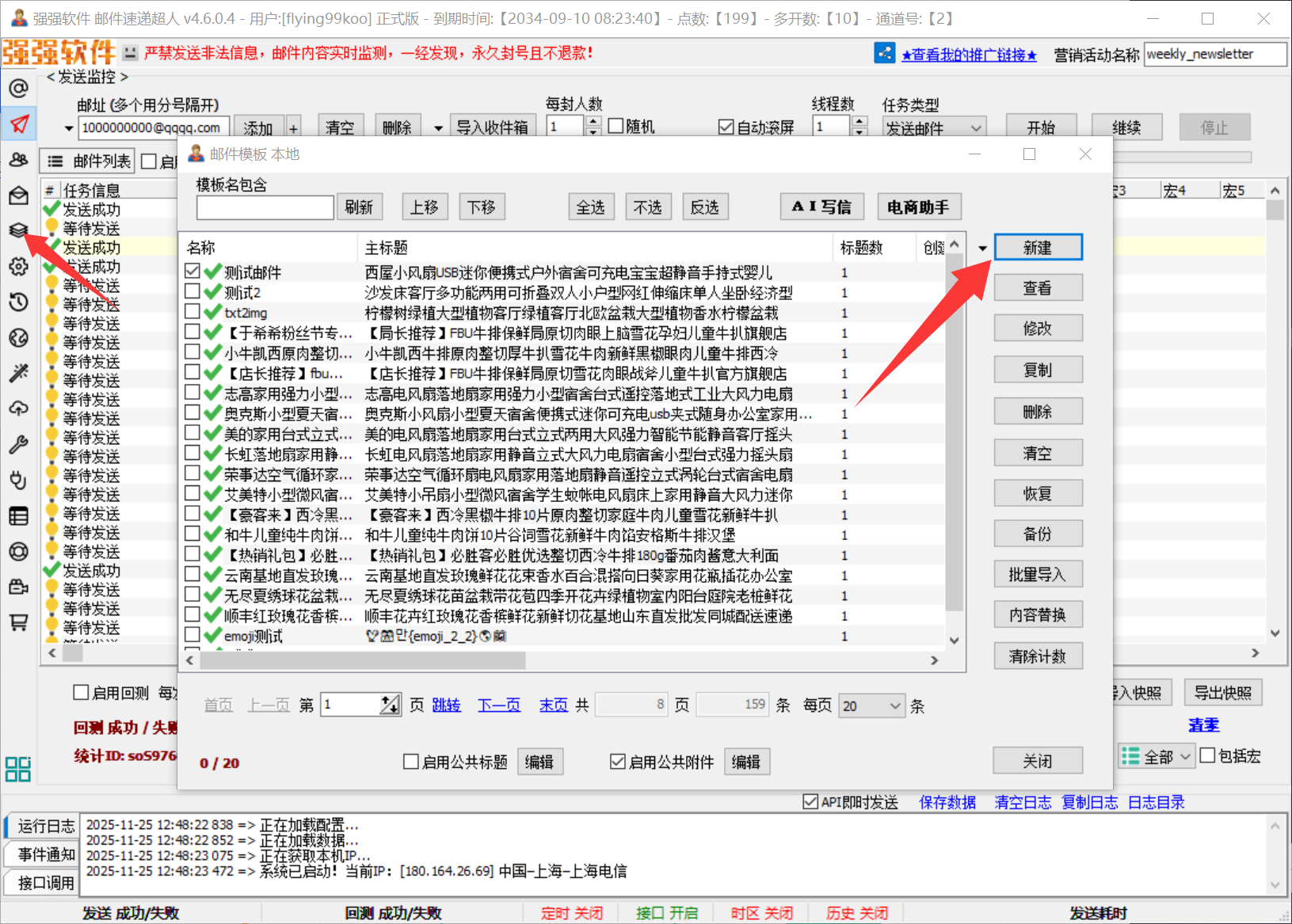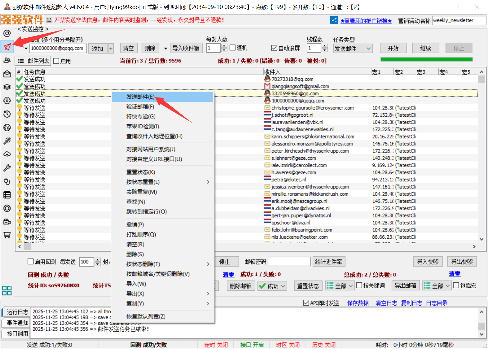 来到“发送监控”界面,添加几个邮址,右键菜单选择“发送邮件”测试一下