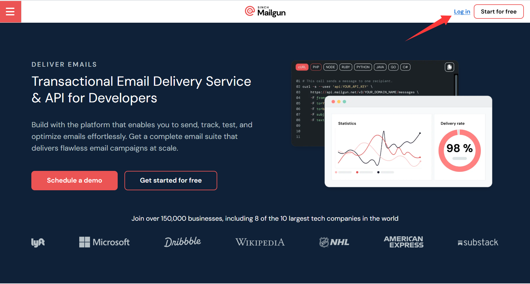 访问 mailgun 官网 https://www.mailgun.com/,点击右上角的 Log in 登录后台