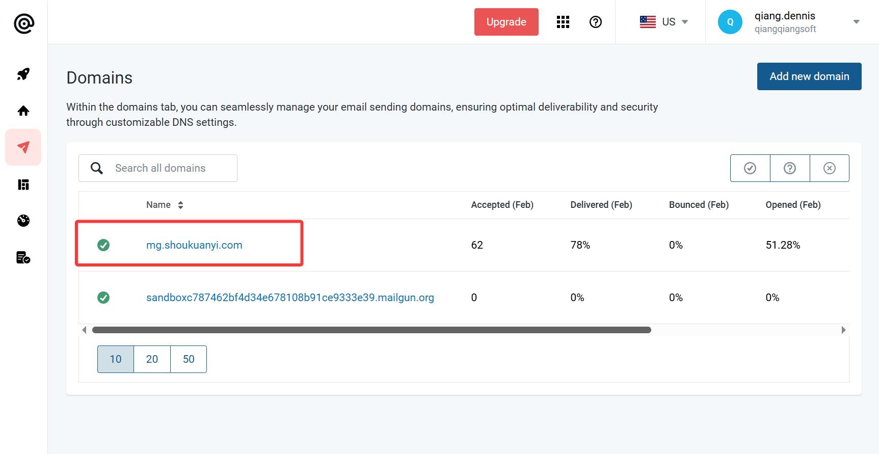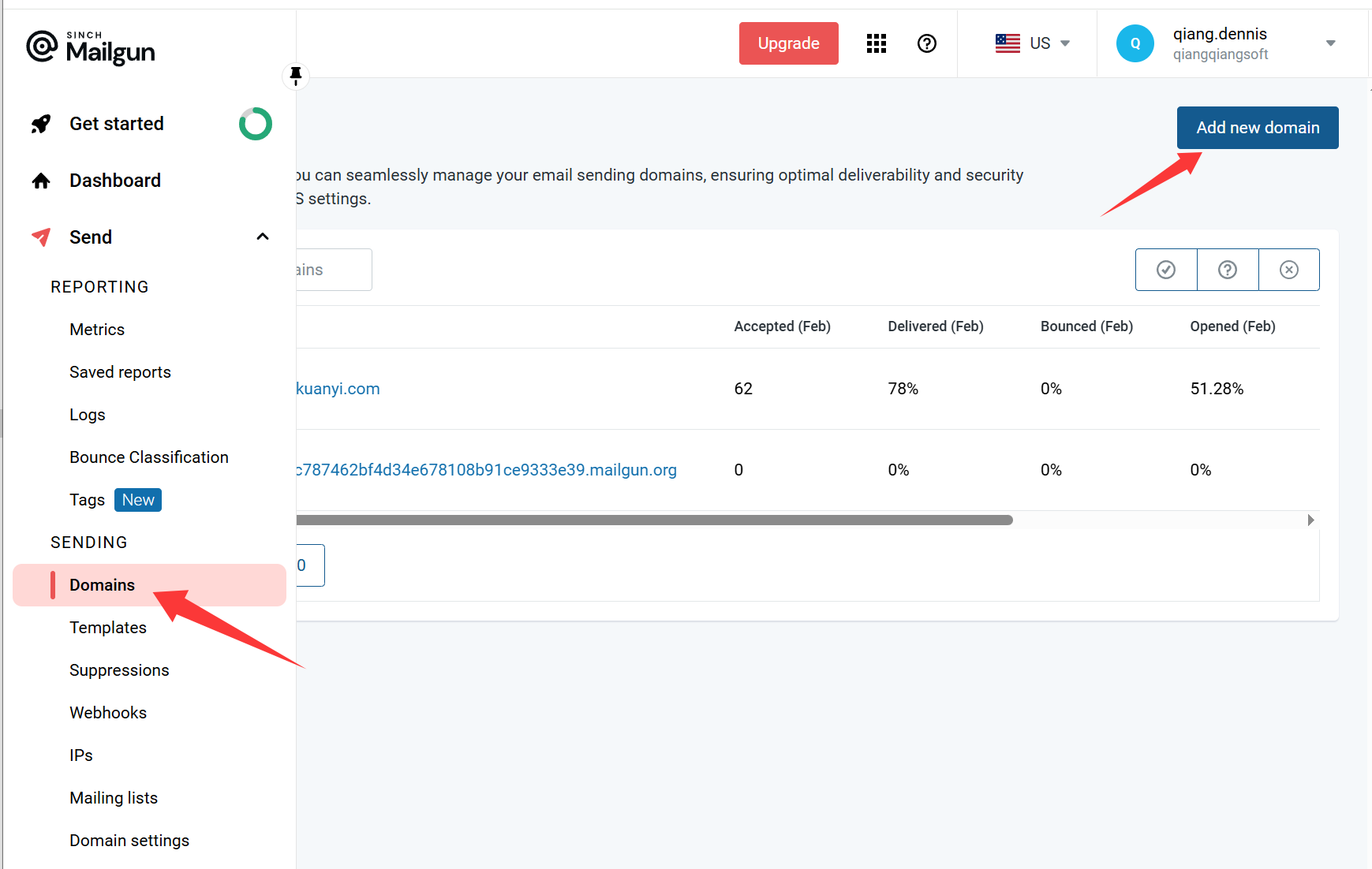 在左侧导航栏中选择SENDING 下的 Domains,然后点击 Add new domain 按钮添加域名