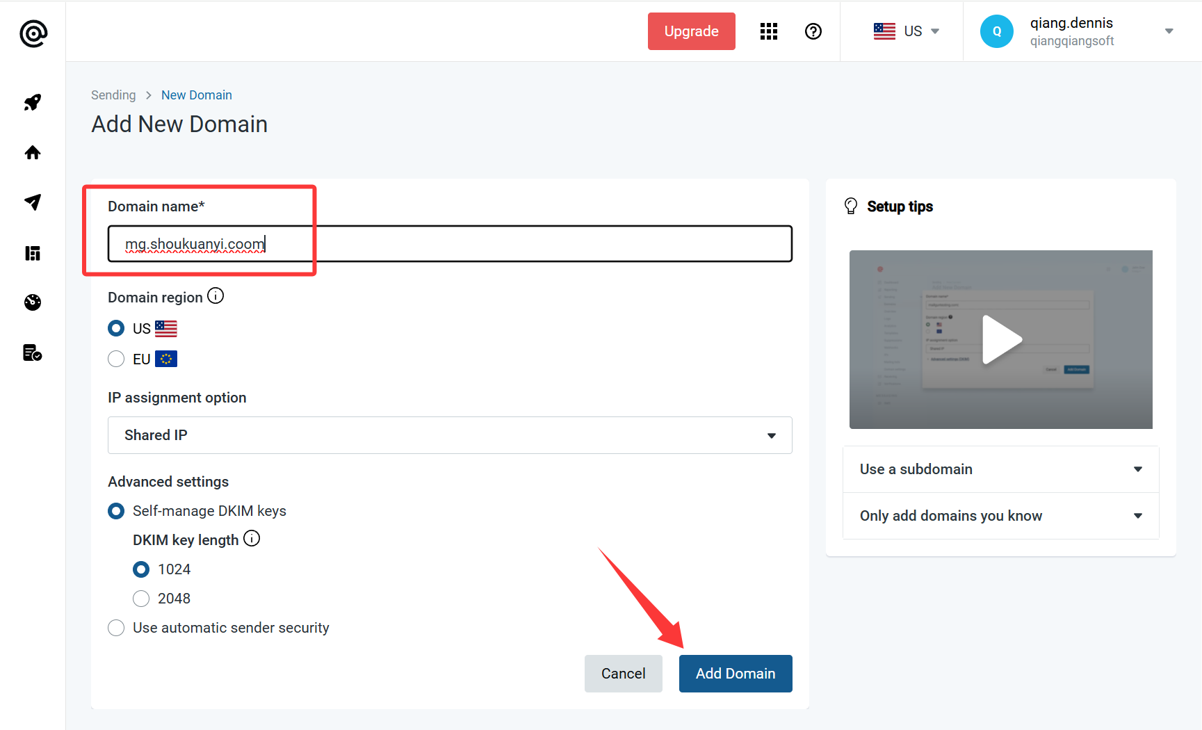 输入你的域名,注意这里要输入二级域名,例如你的主域名是 yourdomain.com 那这里需要输入 xxx.yourdomain.com, xxx是你自定义的前缀,这里以 mg.shoukuanyi.com 为例,其他配置项使用默认即可