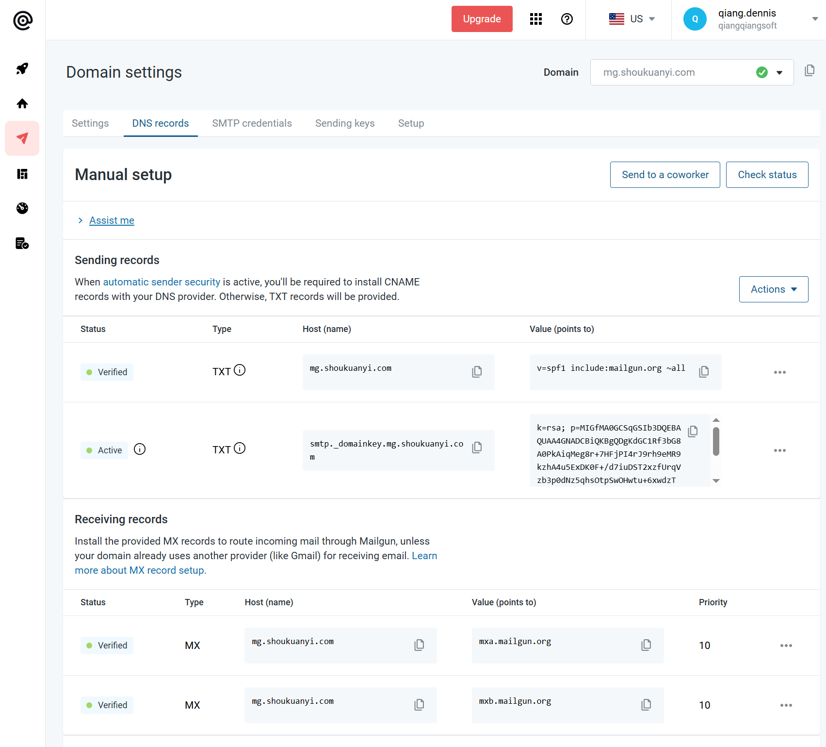之后会显示需要配置的DNS记录,到你自己的域名控制台上依次逐条配置即可
