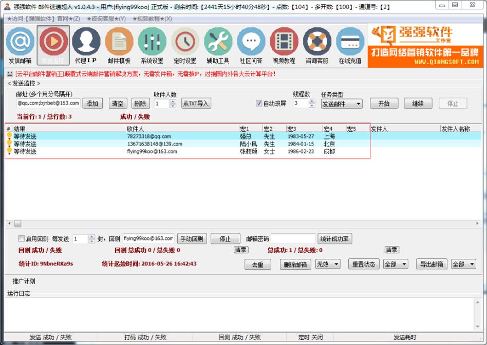 是不是很简单呢? 我们的QQ空间采集王软件可以通过QQ号码抽取出对应的详细资料,如昵称,年龄,性别,地区 等等,利用这个功能,可以轻松的得到带有宏变量的收件人文件,配合邮件速递超人软件的宏变量功能将使你的邮件打开率得到显著提升